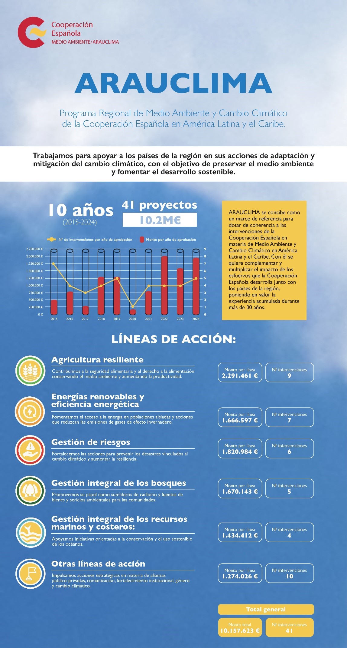 ARAUCLIMA se concibe como un marco de referencia para dotar de coherencia a las intervenciones de la Cooperación Española en materia de Medio Ambiente y Cambio Climático en América Latina y el Caribe. Con él, se quiere complementar y multiplicar el impacto de los esfuerzos que la Cooperación Española desarrolla junto con los países de la región (una de las más vulnerables a los efectos del cambio climático), poniendo en valor la experiencia acumulada.